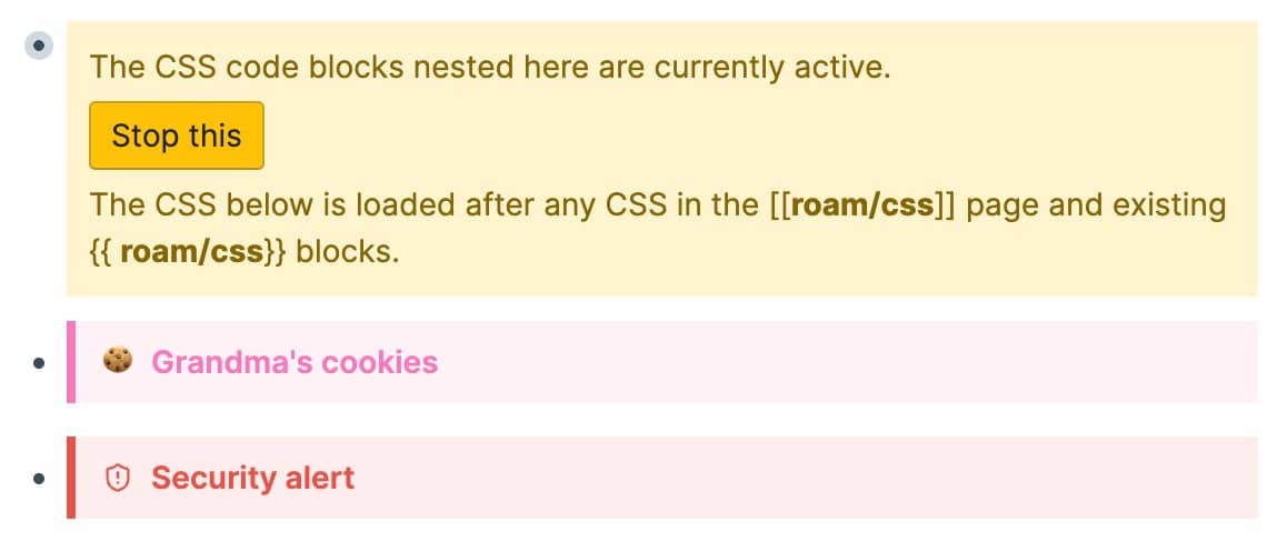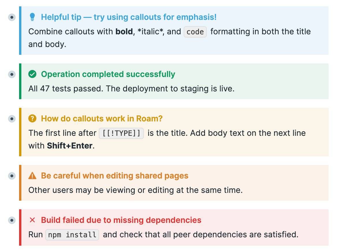 There are more types available including SUMMARY, INFO, DANGER, FAILURE, BUG, and EXAMPLE. See the [[Callouts]] page in the Roam help graph for all available types and how to style your own custom ones. They also fold, which is where it gets really nice. Add Callouts can nest inside headings too: the title scales up while the body stays regular size, which gives you both structure and emphasis in one block. And if the built-in types aren't enough, you can make your own with CSS. Roam falls back to "note" styling for any type it doesn't recognize, but you can override the colors and icons to make it yours. That's how the "Grandma's cookies" and "Security alert" examples below came about. The [[Callouts]] page walks through how to set it up. Quality of Life ImprovementsA few smaller things! Markdown links now handle URLs with parentheses and special characters correctly, so Wikipedia links no longer break. For URLs with really unusual characters, wrapping them in angle brackets ( Right-click any inline code block and you'll see a new "copy code" option — grabs just the code, no formatting. Small thing, but you'll appreciate it the first time you use it. 🐞 Bug Fixes