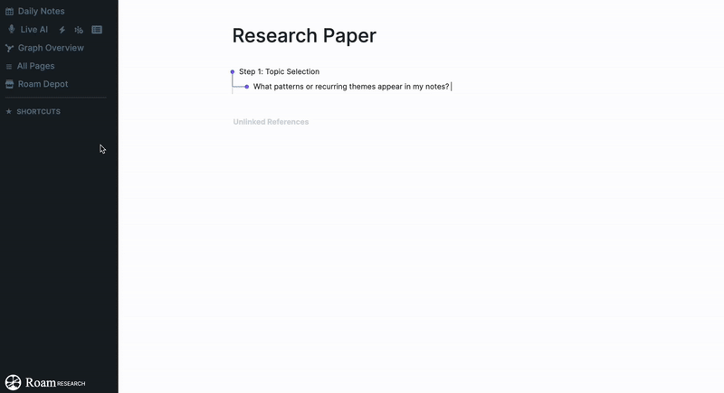 Commentarii Roamani This is the second issue focusing on the Live AI extension, which integrates advanced language models directly into your graph, enabling you to harness the power of AI without ever leaving Roam 🔮 See our previous issue for more if you haven't already! 🧚 Live AI in practice Today we're looking at how to use the extension (created by Fabrice Gallet) as a writing assistant. As we go through the process of writing a research paper with Roam, we'll look at some of the amazing tools it can help us with. This week is Part 1: choosing your topic and gathering sources. 🎃 Step 1: Topic SelectionFirst, you need to find the question you’ll ask for your research paper. If you’re writing a research paper just for fun and have no idea where to start, try the Ask Your Graph tool and use prompts like: