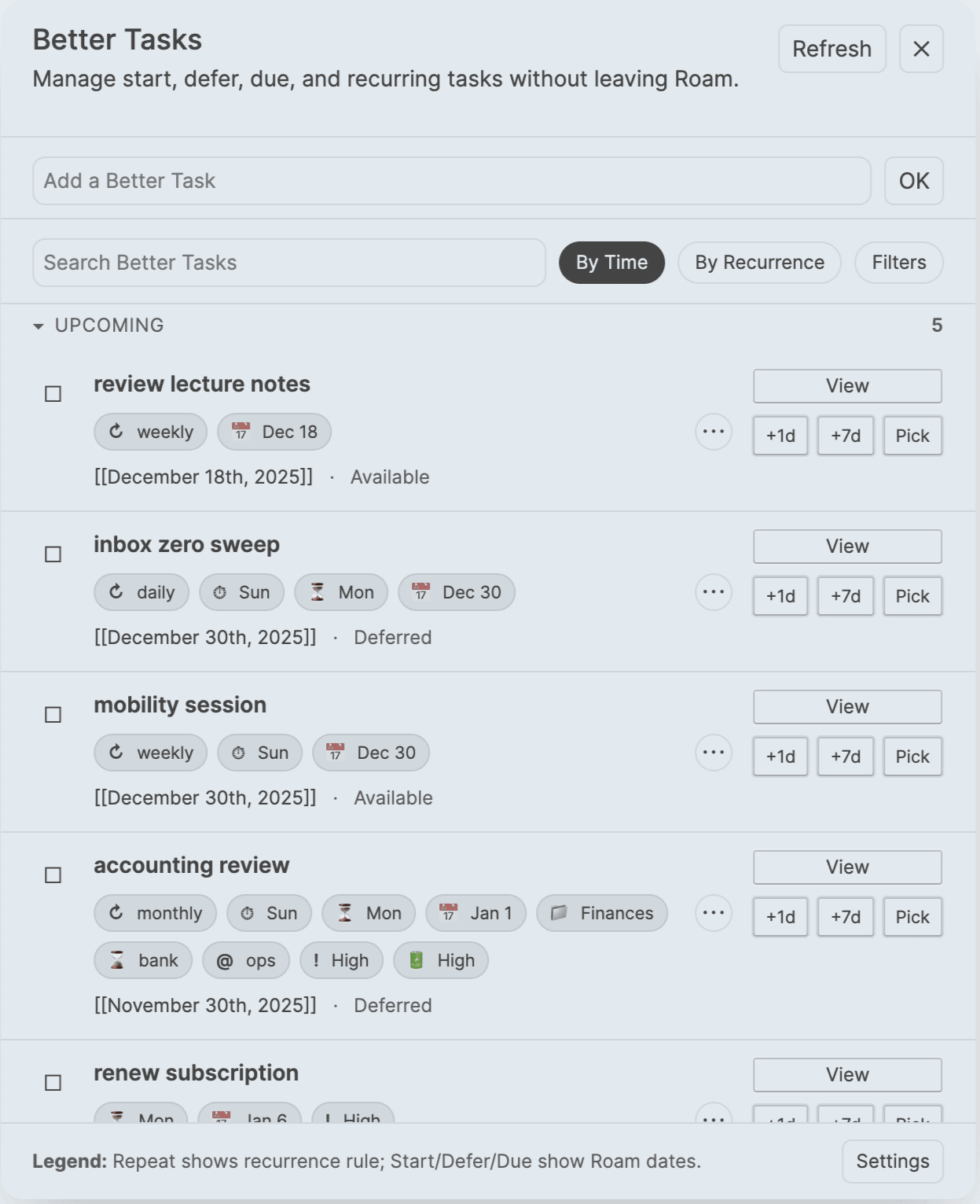 Commentarii Roamani In this issue, we look at Better Tasks, a Roam Depot extension by Mark Lavercombe that brings structured, repeatable task logic directly into your graph. It treats each TODO as a block with clear attributes: repeat, start, defer, due so you can manage tasks without leaving Roam or maintaining a second system.