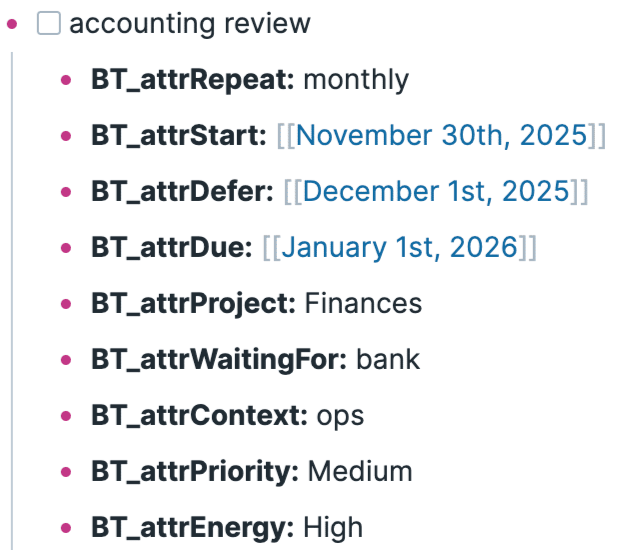 Completing the task writes a completed attribute and, if a repeat rule is present, creates the next occurrence according to your settings. You can add optional attributes for availability and resurfacing: