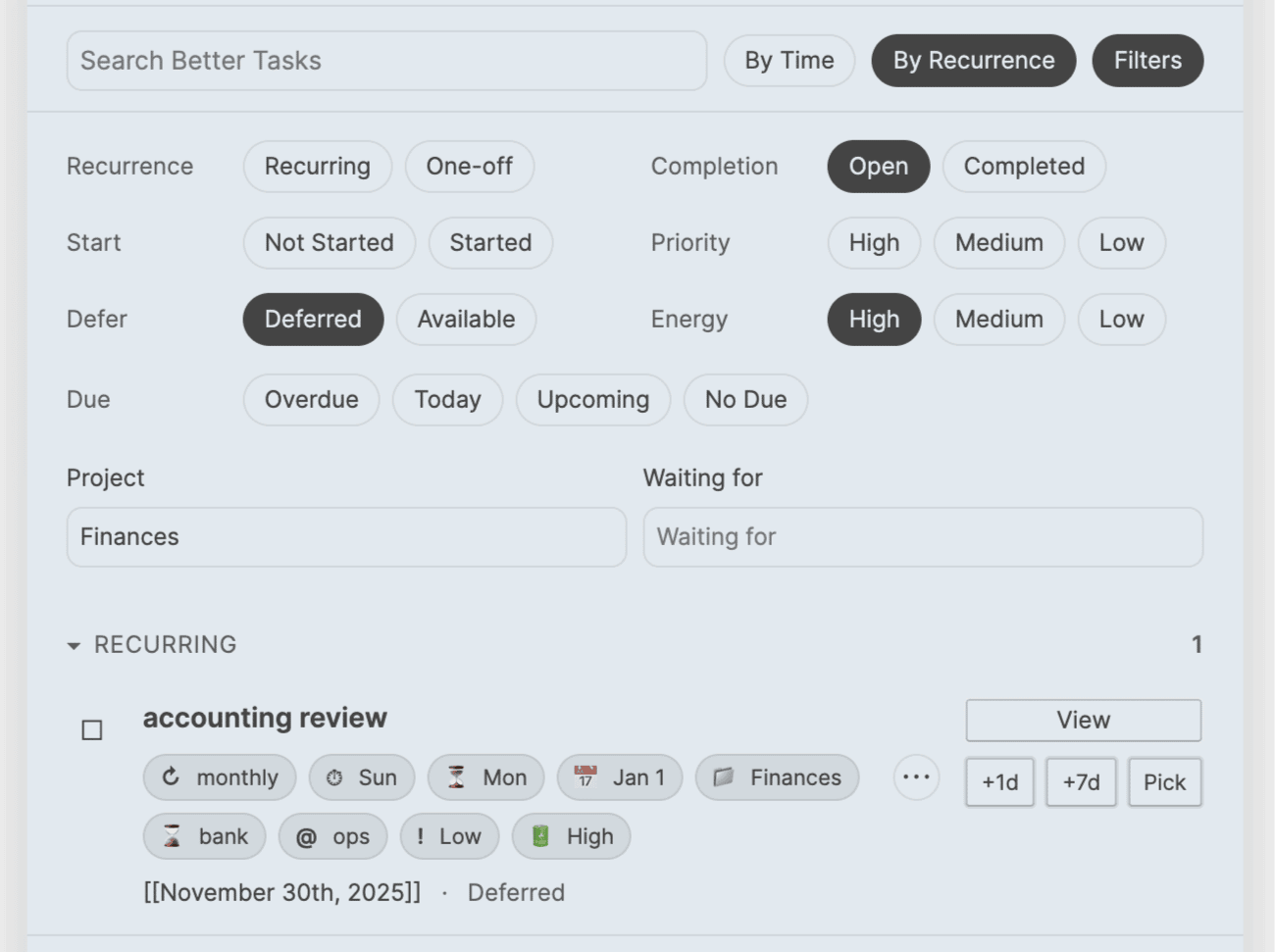 It updates automatically as attributes change and gives you filters for recurrence, start/defer status, due buckets, and completion state: