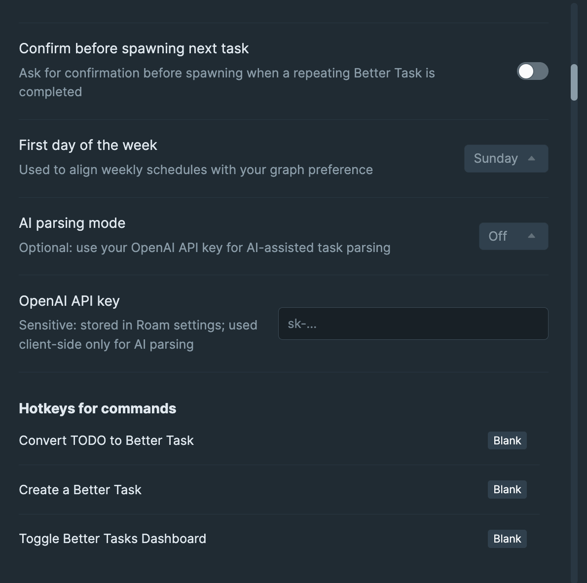 You can also enable confirmation before spawning the next task, set the first day of the week, turn on AI parsing with your own API key, and adjust the checkbox threshold for pill rendering: