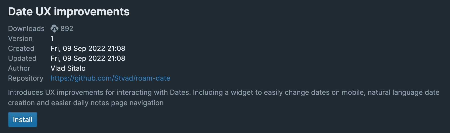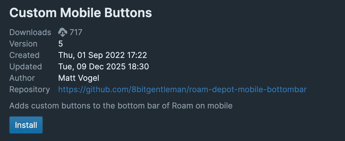 You can find all of these in the Roam Depot section inside your Roam Graph. To install them, simply click Install. Custom mobile buttonsCustom Mobile Buttons adds configurable buttons to the bottom bar on mobile, giving you quick access to common actions like opening and closing blocks, triggering SmartBlock workflows, and formatting text. A simple way to reduce friction for actions that are easy on desktop but sometimes clunky on mobile. Mobile gesture actionsMobile Gesture Actions lets you map gestures like swipes, double taps, long presses, pinch, and rotate to Roam actions or keyboard shortcuts, such as navigating daily notes, opening sidebars, undo/redo, or opening the command palette. Especially useful on mobile, where it lets you navigate without relying on menus or precise taps. Date UX ImprovementsThis extension enhances daily page workflows in Roam by adding a date widget next to date links. Use it to quickly adjust dates, navigate between daily notes, or create new daily pages using natural language. Change Log 🪵 🌱A few new extensions were added to Roam Depot recently. We didn’t cover them in depth in this issue, but they’re on our radar and we're excited to explore them in upcoming newsletters: In future issues, we’ll also take a look at the very exciting new features and updates added to Roam Reader (if you haven't already, check out our newsletter on it here!) Join our slack channel here, and don't forget to check out the Roam help graph for updates!