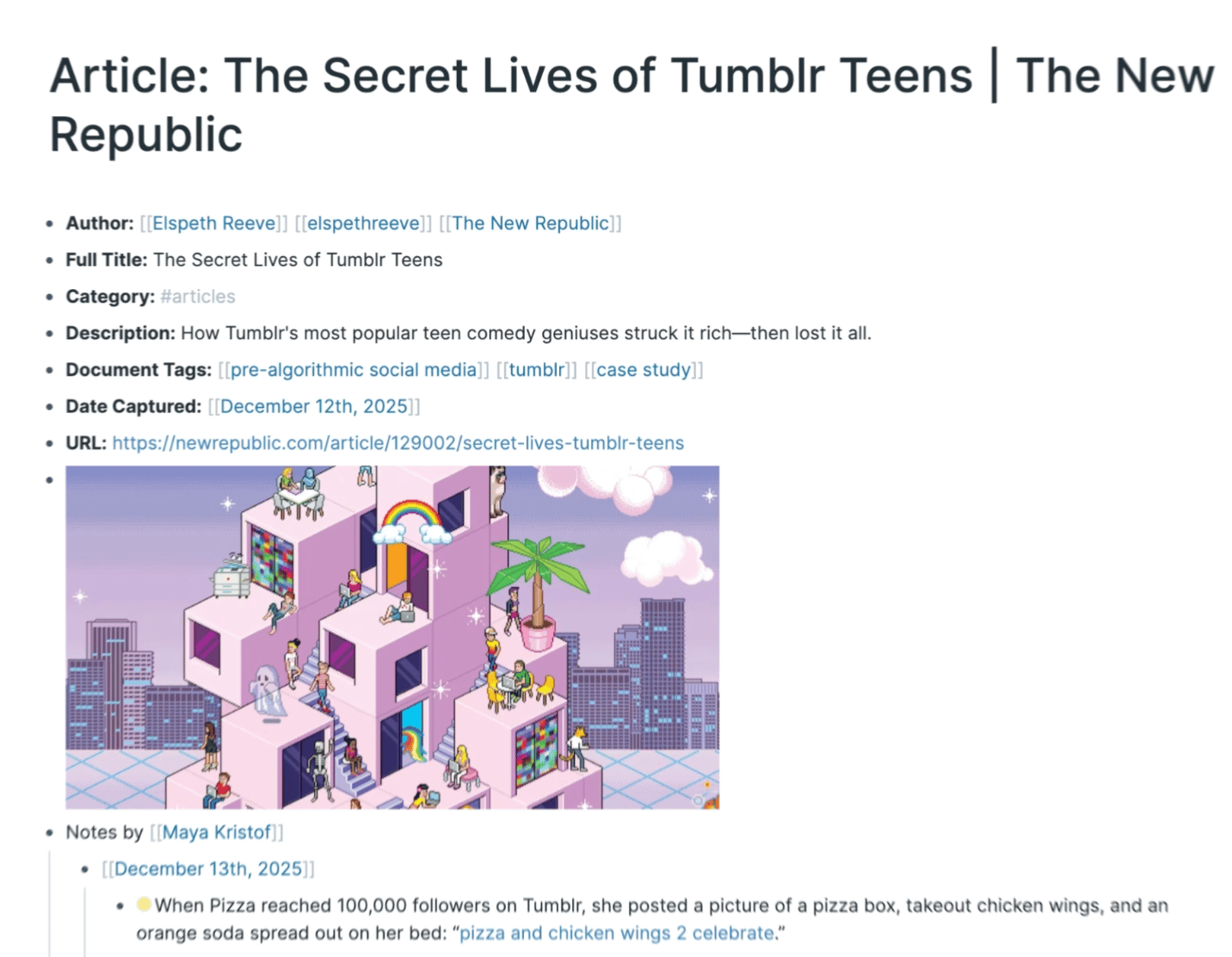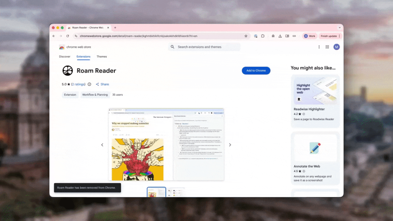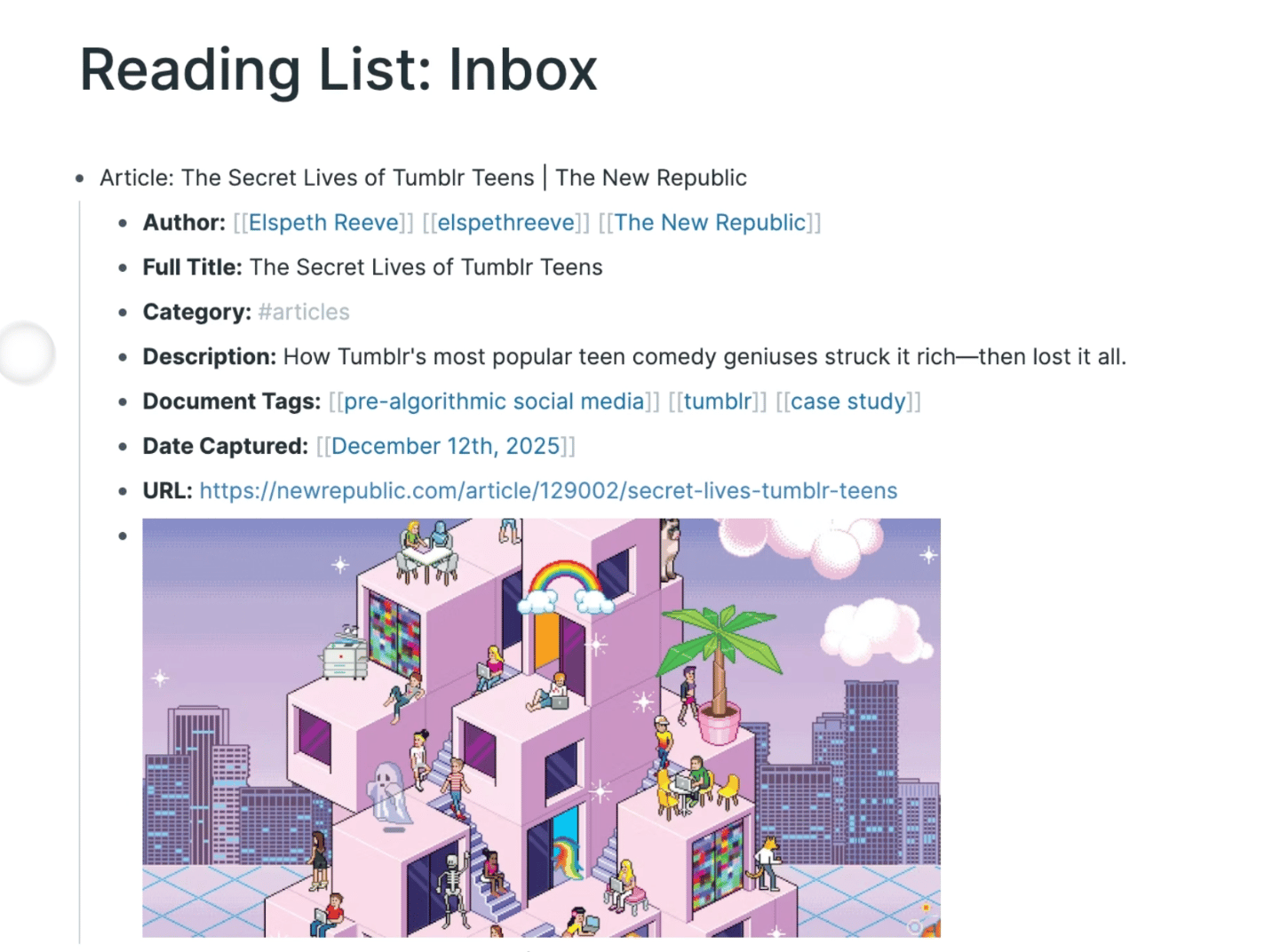Commentarii Roamani Reading produces value when a thought interrupts the page. A sentence lands, a question forms, a connection starts to appear, and then the article keeps moving. What matters is whether that moment turns into something you can work with later. Roam Reader is your tool for reading intentionally: remix your notes, comment on them, tag them, nest them. Watch our in-depth tutorial on YT here and our thread on X! It's built around capturing the moment in a form that stays flexible. As you read on the webpage itself, your notes are directly by it, in the sidebar. The article remains intact, with its intended layout and context but your thinking grows alongside it. Your notes could then be remixed, pulled into other parts of your graph, and reused across projects. Over time, reading produces fewer static traces and more material that stays alive inside your system. Setting it UpVisit the Chrome Web Store and find the Roam Reader extension. Then, add it to chrome and pin it to your Address Bar. Go to the article you wish to read or annotate with Roam Reader, click the astrolabe once to sign-in via Google/Apple or Email+Password and a second time to select which graph to use for your reading lists and annotations. Saving an Article to your Reading ListTo save an article to your reading list, click the astrolabe in the top right corner to open the menu. Tweak the metadata as you like, and add some tags. Click on Save To Inbox or some of the other default reading lists like: Shortlist & Archive. Taking Notes & HighlightingWith the article open, click the astrolabe icon and choose Take Notes instead of saving it to your reading list. A sidebar opens beside the page, where you can start writing notes under today’s date, indented beneath Notes by [[User]]. To highlight, select text in the article and click the highlighter icon that appears. You can also choose a highlight color! Each highlight is added automatically to the sidebar, ordered according to its position in the article. If you indent the empty bullet beneath your most recent highlight, the next highlights will nest underneath it, making it easy to outline and group related passages as you go. You can add tags and comments as you highlight using the icons provided. Roam handles the formatting for you, inserting the # and indentation automatically. How It's Organized In RoamIn Roam, to avoid cluttering your graph, saved articles first appear as blocks on [[Reading List: Inbox]]. They remain simple blocks with their metadata nested underneath. Each entry follows the default template set in your Roam Reader settings, which you can change at any time. Only when you start taking notes on an article does it expand into its own page. If you want more structure, you can update the title template to use a namespace-based format, which keeps reading material grouped and easier to navigate as it grows. Roam Reader is designed to stay close to how reading on the web already works. Many articles today are readable, carefully laid out, and worth engaging with in their original form. Stripping them down -- as most reader apps do -- often removes context, structure, or even content that matters. You read where you are, take notes intentionally as ideas land, and let structure form early without interrupting the flow. Notes remain flexible, reusable, and easy to pull into the rest of your graph when they become relevant. If you already use Roam to think, write, or plan, this fits naturally. Reading becomes another input to your system, shaped as you go, and still usable long after the tab is closed. onward! roam & read:)